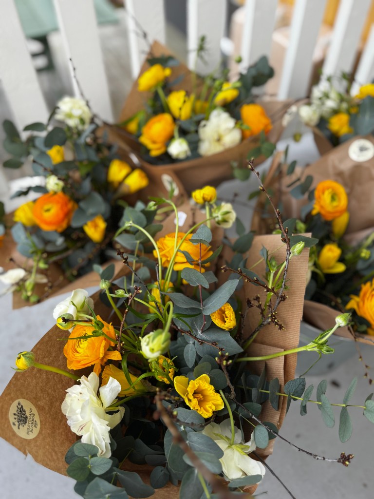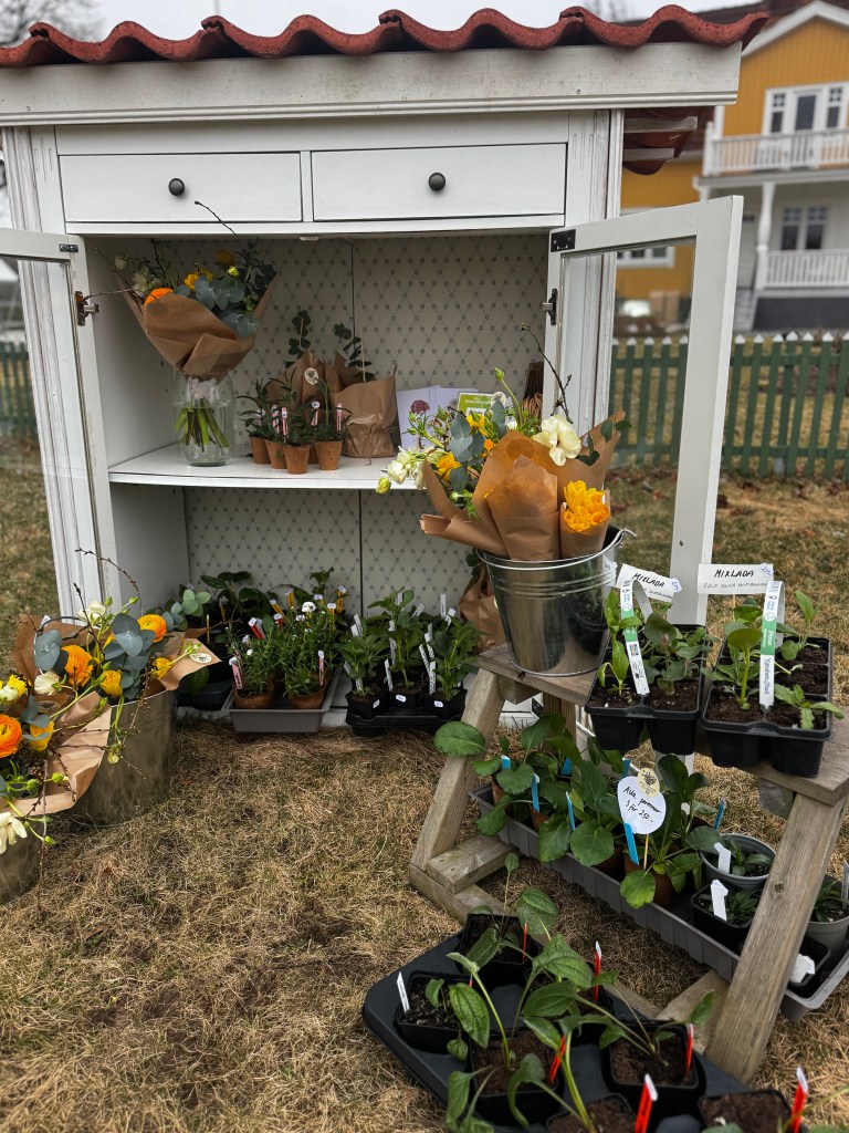 Blomsterkiosken är en obemannad Swish & Grab-kiosk hemma vid Solstugan. Här kan du köpa blommor i säsong: allt från tidiga narcisser, tulpaner och uppdrivna plantor i april-maj, till härliga sommarbuketter i juni-september, och julkransar i december. Via min instagram uppdaterar jag löpande om utbudet i Blomsterkiosken.